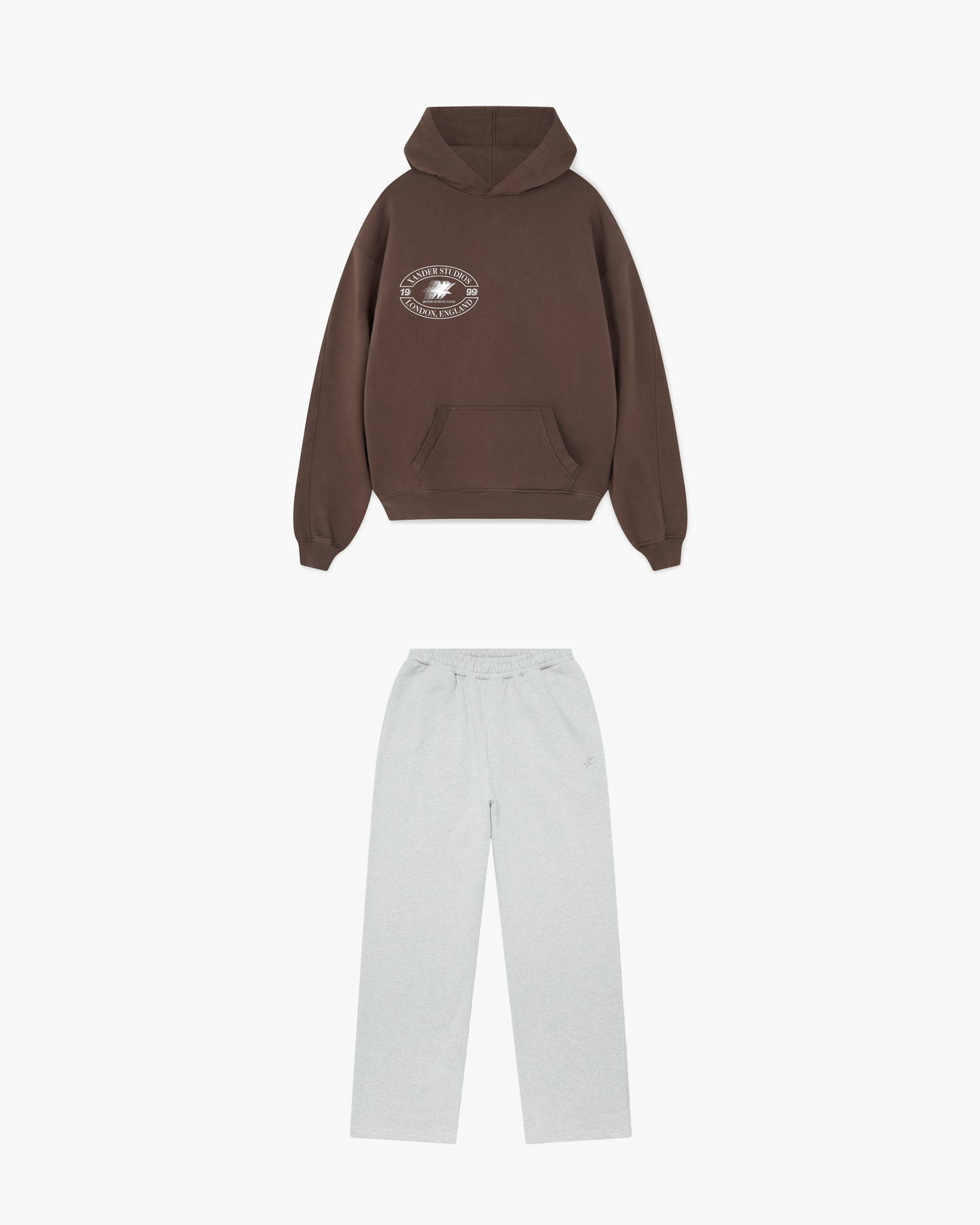 The hoodie features a boxy silhouette with dropped shoulders and a relaxed, sport-inspired fit in Dark Brown. It’s paired with grey marl sweatpants cut in a relaxed straight-leg shape, finished with internal cotton drawcords and a 100% cotton label on the back welt pocket detailing the garment’s composition. Subtle embroidery completes the set, with our logo placed on the hoodie cuff and beside the jogger pocket for a clean, understated finish.
