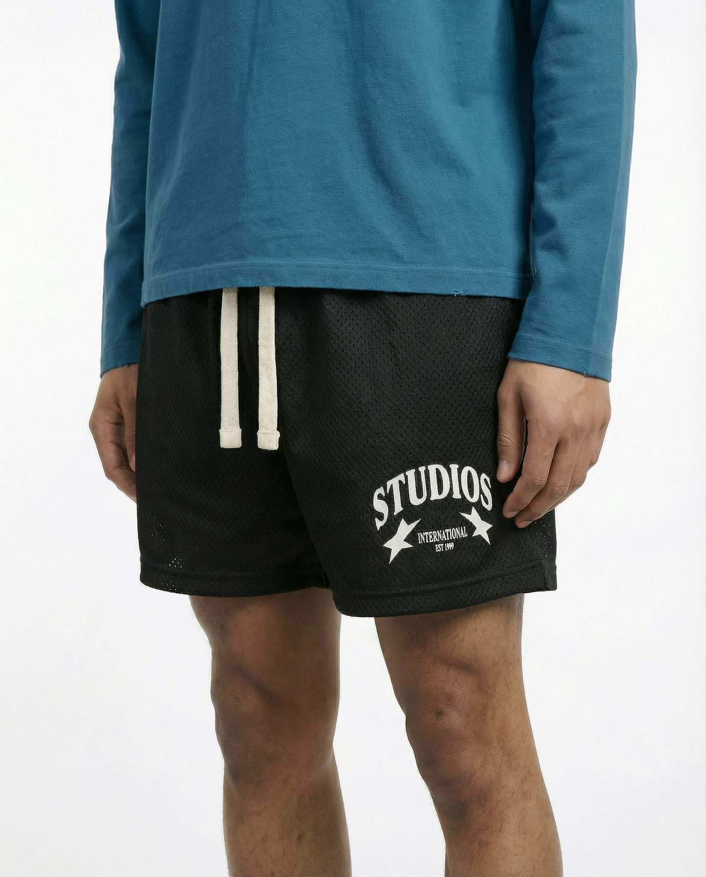 Our SS25 mesh shorts are cut from breathable classic polyester mesh and double lined for structure and comfort. Featuring an athletic fit, elasticated waistband, and 100% organic cotton drawcords, they’re finished with our signature International Studios logo — a refined take on sport-inspired streetwear.